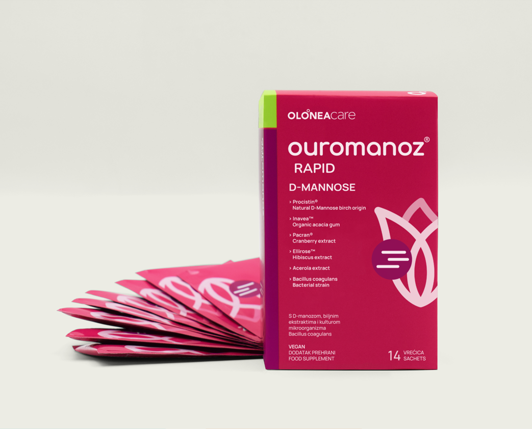 ouromanoz® RAPIDPrirodna D-manoza iz breze, brusnica PACRAN®, Ellirose hibiskus, kulture mikroorganizama, prehrambena vlakna i vitamin C iz acerole – formulacija za intenzivnu podršku urinarnom traktu.