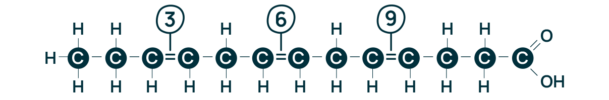 When counting carbons (C), one starts from the last one, therefore fatty acids are called “omega” named after the last letter of the Greek alphabet. The position where the first double bond between the (C)s lies finally defines the name of each fatty acid.